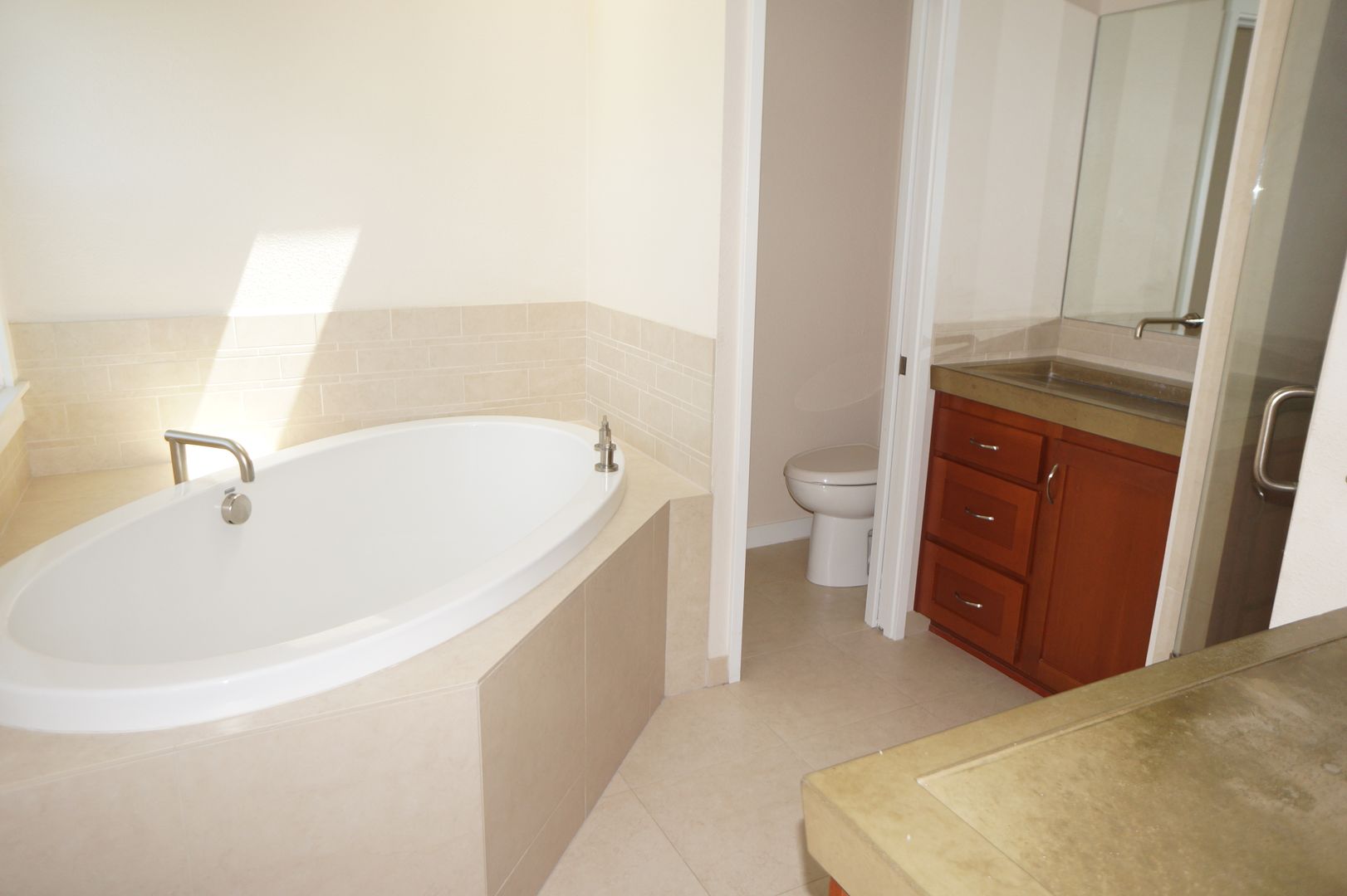 Upstairs - The Primary suite is delightful with its high ceilings and an open view, and the bathroom is amazing with heated floors and concrete counters. This level features two additional bedrooms and a full bathroom.